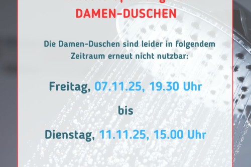 Zurück Erneute Sperrung Damen-Dusche Leider sind unsere Damen-Duschen nochmal gesperrt und zwar in folgendem Zeitraum: Freitag, 07.11.25, 19.30 Uhr bis Dienstag, 11.11.25, 15.00 Uhr Vielen Dank für dein Verständnis!